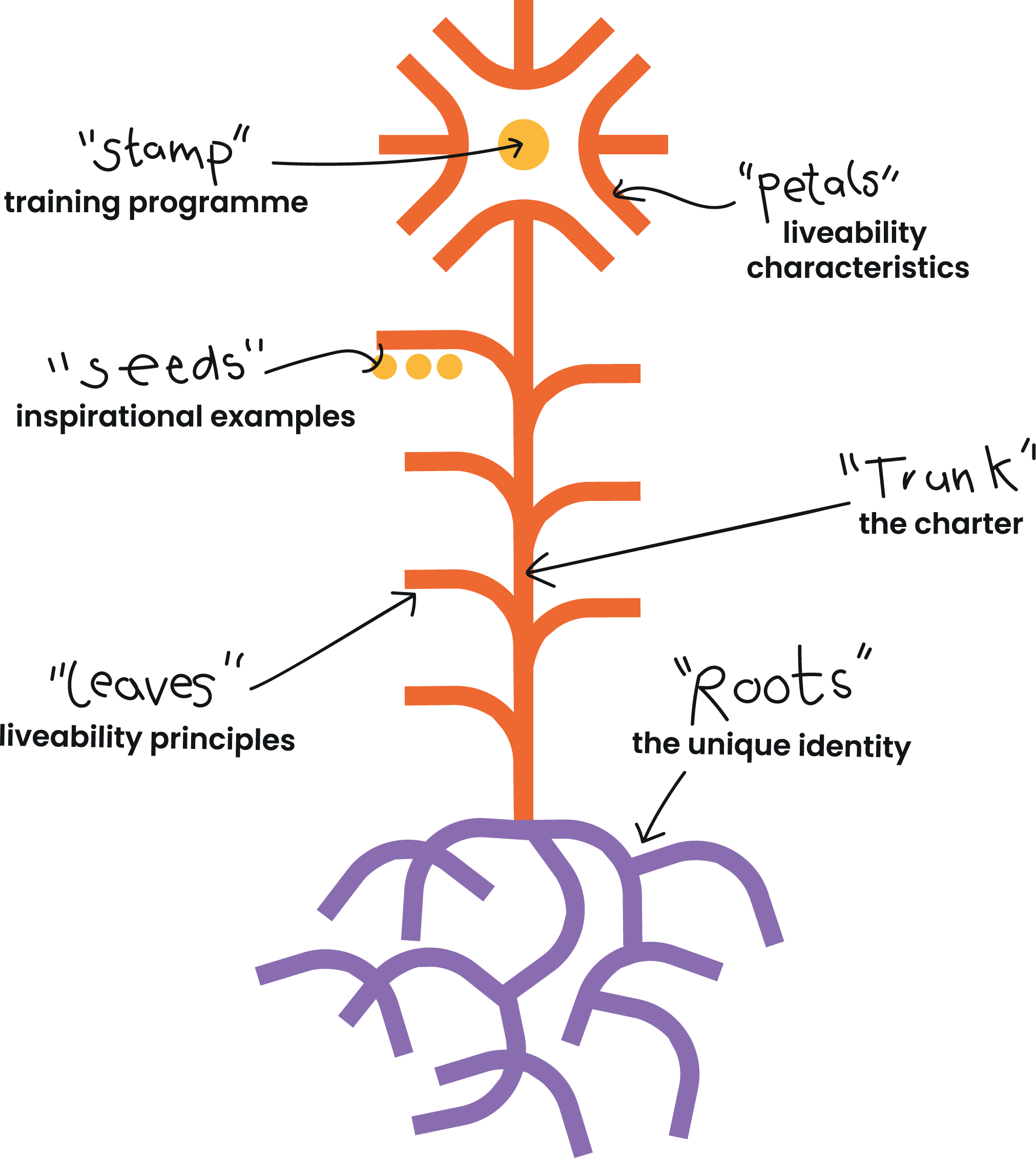 The trunk represents the Charter for Designing Liveable Cities — the central framework that supports the entire structure.
